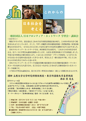 日本フロンティア・ネットワークでは、西谷修先生をお招きし「これからの日本社会を考える」をテーマに学習会&講演を開催いたします。