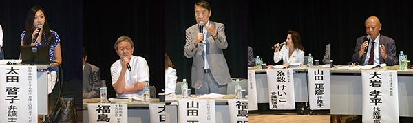 第一部では、明日の自由を守る若手弁護士の会(あすわか)の太田 啓子弁護士、秋田雨雀・土方与志記念 青年劇場  福島 明夫代表、元農林水産大臣 山田 正彦弁護士、沖縄の風・代表 糸数 けいこ参議院議員、一般社団法人東友会 大岩 孝平代表理事(東京都原爆被害者団体協議会・会長)をコーディネーターの一般社団法人日本フロンティア・ネットワーク 永戸 祐三会長とコメンテーターの立教大学  西谷 修特任教授が進行するカタチで行われました。